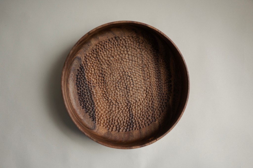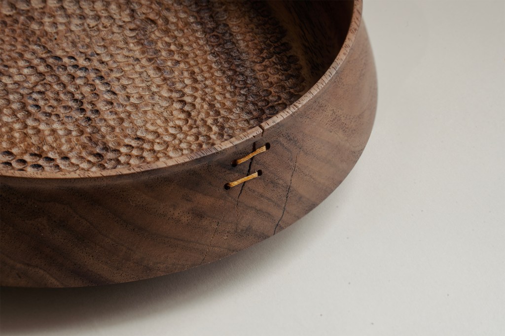 Claro Walnut, 10×2.5 inches, beeswax finish, stabilized with waxed thread.