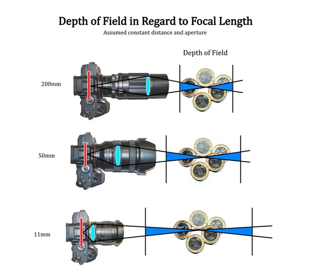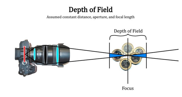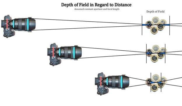 In the diagram, the point of focus is indicated by the intersecting lines. This is the most in focus point. As the lines spread from that point, light begins to scatter and that part of the image is gradually less in focus but our eyes are unable to tell. There is a point at which the part of the image is considered to be out of focus and that’s where the end of the field is. The area filled in with blue is representative of the total area in focus, or the total depth of field. This volume is fixed. Now that we have the depth of field defined, how do we change the depth of field? There are three ways. By manipulating the distance to your subject, the aperture, and the focal length.