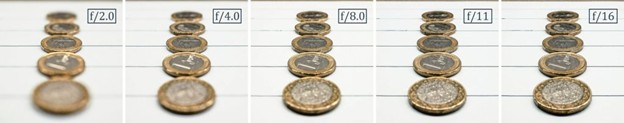 This is maybe the most common method of affecting change. Inside the camera lens there is an iris. Its measured with aperture value. You’ll see it written a couple different ways, either as f/2.8 or f2.8. The slash actually serves a purpose however, its the mathematical equation part. Where f= focal length of the lens, divided by the aperture, equals the diameter of the opening in the lens in millimeters. For example, a 50mm lens @ f/1.8 = 27.7mm opening. Which brings me to another point, why do people call a large aperture large if the f number is small. Because they’re really talking about two different things. I suppose its easier to say large aperture vs large iris diameter. Back to our coin example. Like the first example we had with distance, the blue is indicative of the total depth of field and is a fixed volume. In the middle of the lens there is now a representative aperture. From the top illustration, f/4 will yield a wider angle, and a more narrow depth of field. Stop it down to f/16 and nearly everything is in focus.